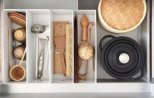 【技巧三】抽屜:收拾完明面上的雜亂,該收拾隱藏在里面的雜亂了,我們以抽屜為例。遵循大廚房收納原則,讓廚房整齊又干凈。