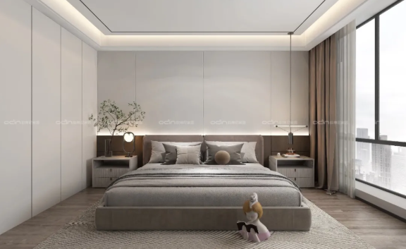 一隅方寸內(nèi),陽光充足,綠意盎然。臥室延續(xù)室內(nèi)整體設(shè)計(jì)風(fēng)格,以理性克制的色彩表達(dá),構(gòu)建了一個(gè)低調(diào)舒適的自然空間。一門到頂?shù)墓耋w設(shè)計(jì),直通上下,時(shí)尚美觀。