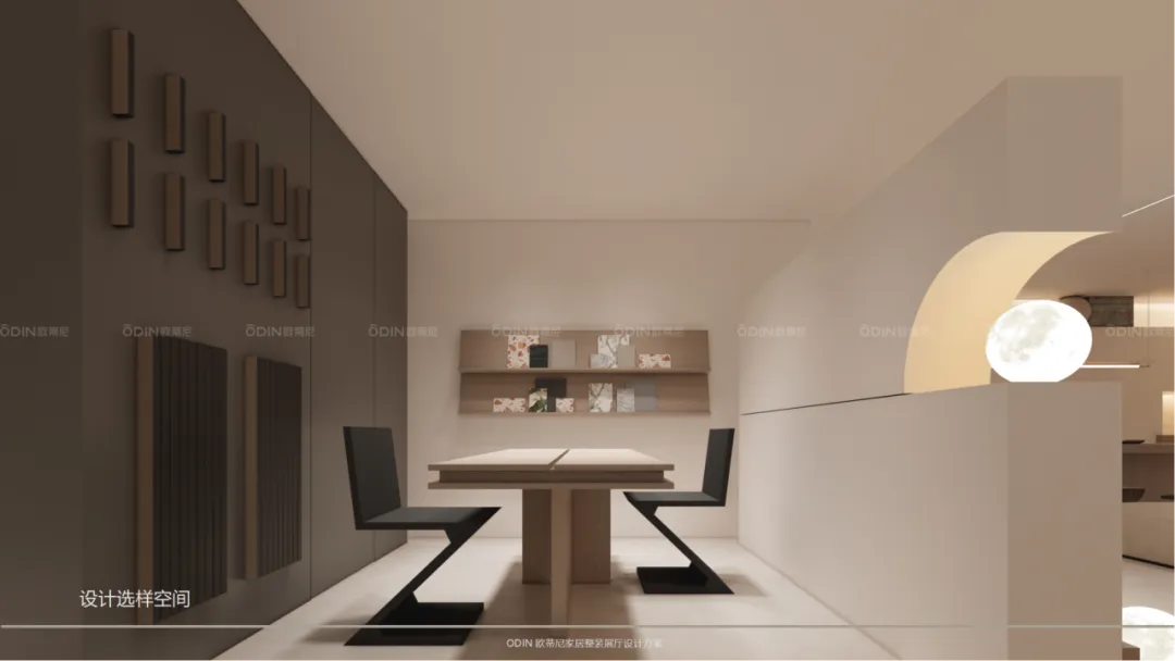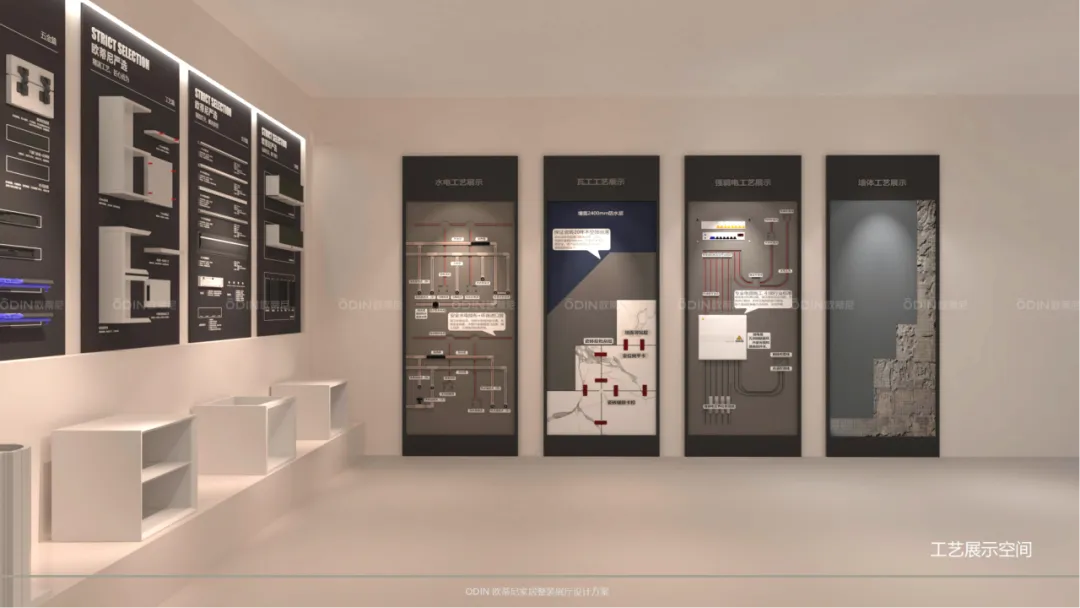 作為展廳的核心區(qū)域,公共體驗(yàn)區(qū)集成了設(shè)計辦公、工法道具展示、硬裝工藝展示及VIP洽談區(qū)等多個功能區(qū),為客戶提供了全方位、一站式的服務(wù)體驗(yàn)。